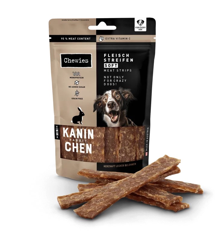 Twój pies pokocha Chewies® Paski Mięsne Soft Królik 70 g oraz 150 g! Dzięki 95% delikatnie suszonego mięsa mają wyjątkowo intensywny smak i doskonale sprawdzają się zarówno jako codzienny smakołyk, jak i nagroda.